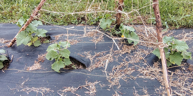 | Young cucumbers just starting out- these are very healthy-looking plants. They're dark green, bushy, and have no damage. |